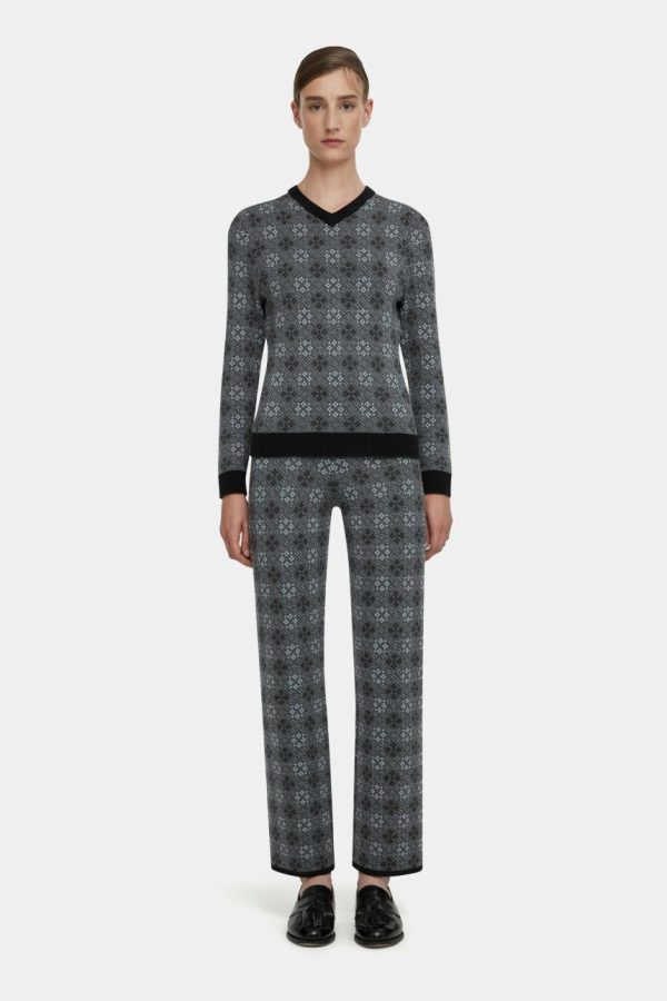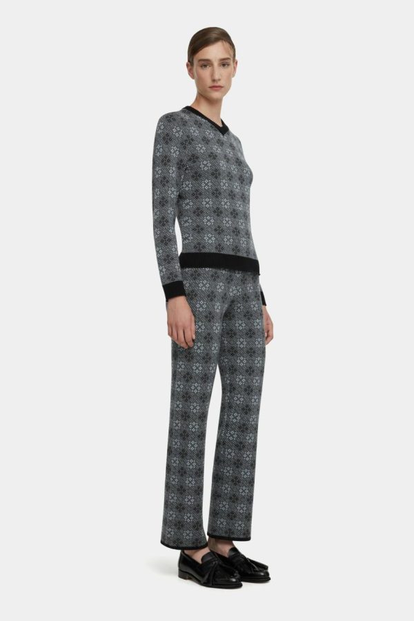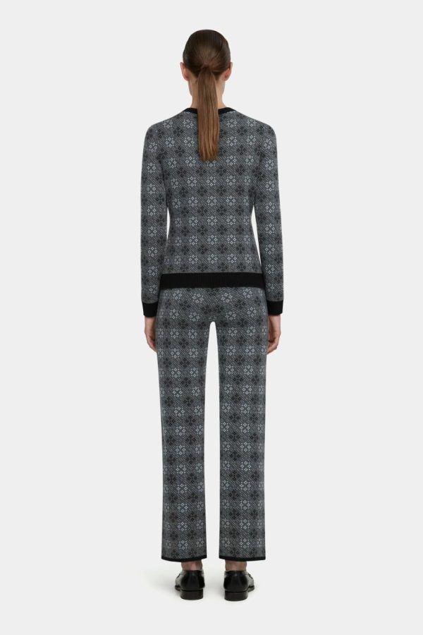 Crafted from a cashmere-esque yarn, the Penn knitted top features a quirky birds eye jacquard motif. Contrast tipping at the neckline and cuffs add definition to the piece. Pair with the coordinating Lowe trousers.